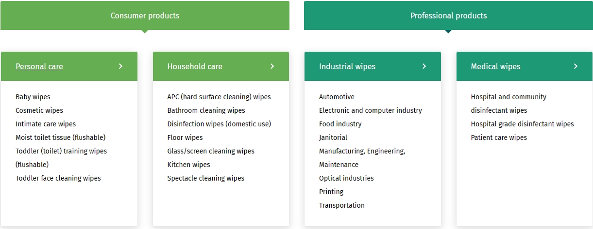 They are divided into two main categories regarding if they are considered a consumer product or a professional product. The consumer wipes are divided into personal care usage and household care usage, as the professional wipes are the ones used in industrial applications and in the medical sector.